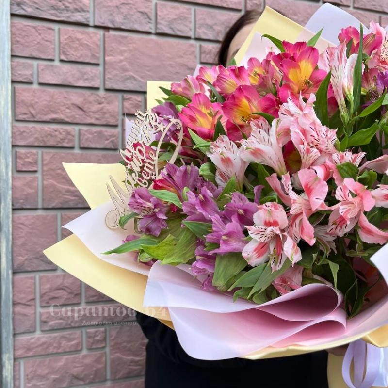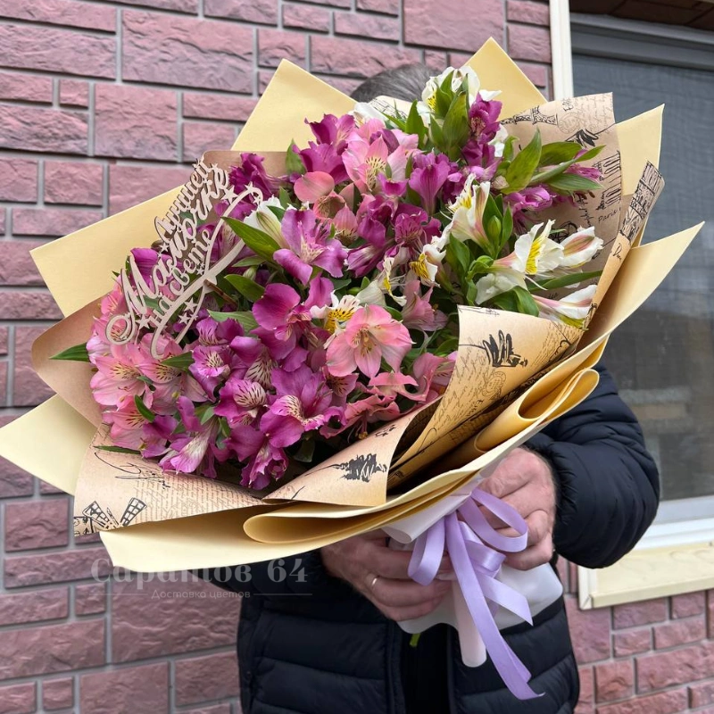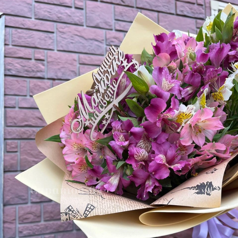 Букет из альстромерий микс, элегантно упакованный в крафтовую бумагу с декоративным бантом. Нежные оттенки цветов создают трогательную композицию, идеальную для выражения тёплых чувств. Деревянный топпер с трогательной надписью добавляет особый шарм.