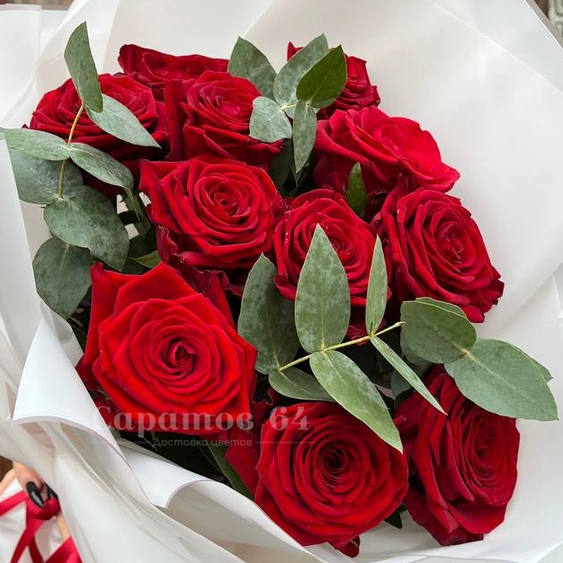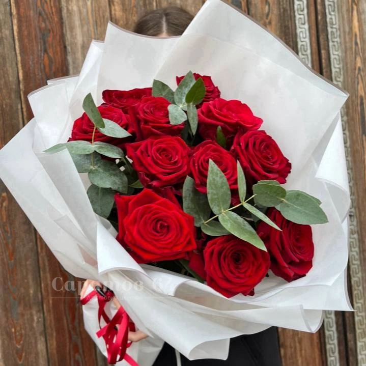 Букет 11 красных роз с эвкалиптом