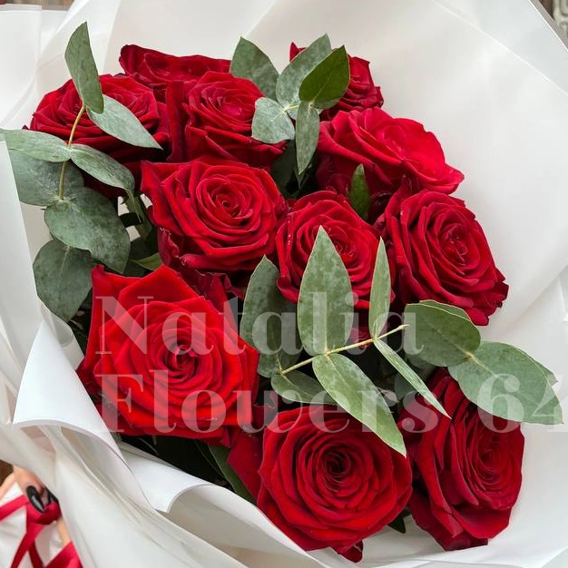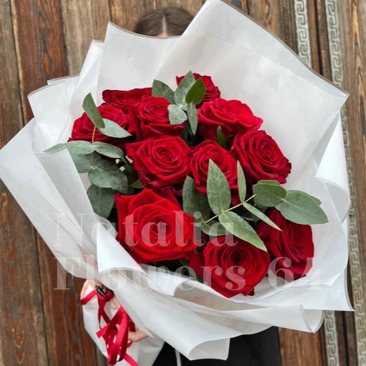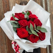 Букет из 11-ти роскошных красных роз, элегантно дополненный свежими веточками эвкалипта. Нежные зеленые листья оттеняют яркие бутоны, создавая гармоничный и стильный образ. Идеальный выбор для выражения страстной любви и глубоких чувств.