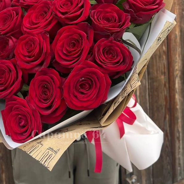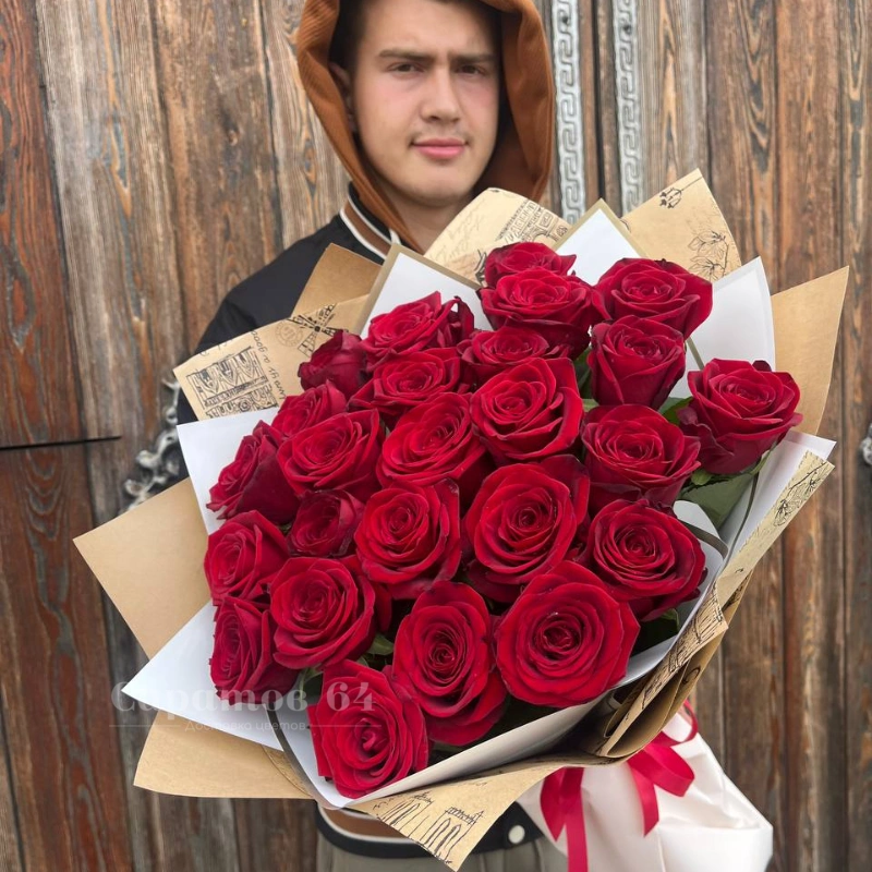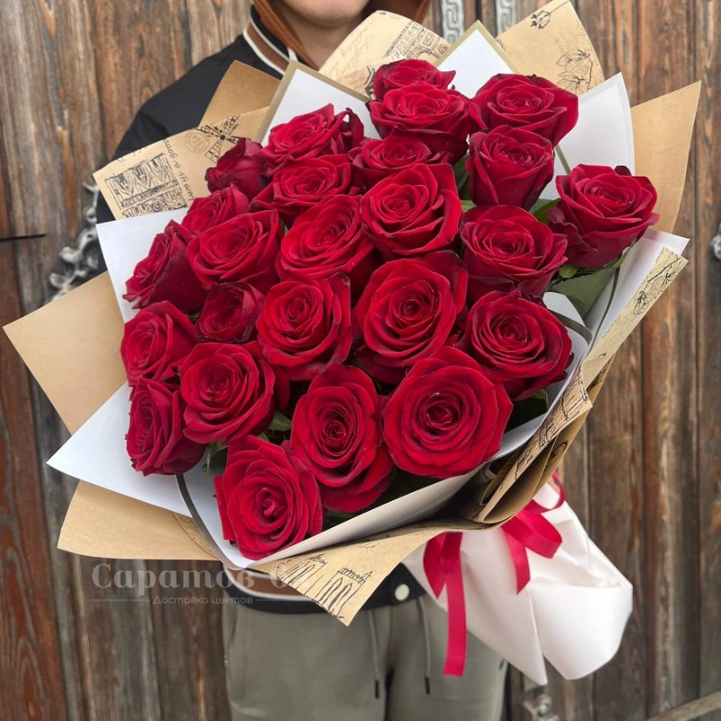 Роскошный букет из 25-ти ярких крупных алых роз. Этот величественный букет способен произвести неизгладимое впечатление на получателя, прекрасно подойдёт в качестве подарка на юбилей или годовщину важной даты.