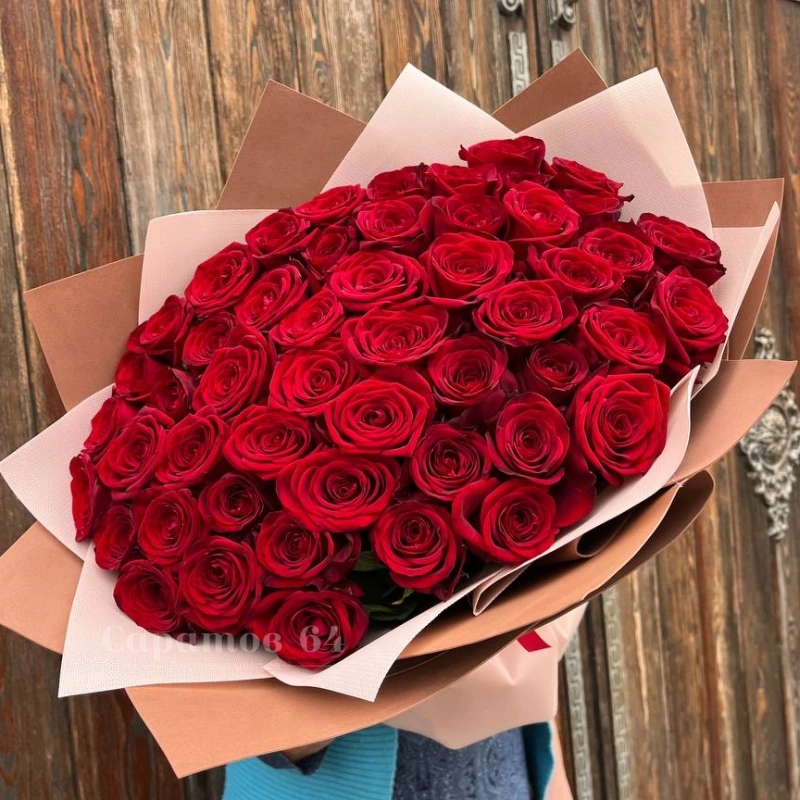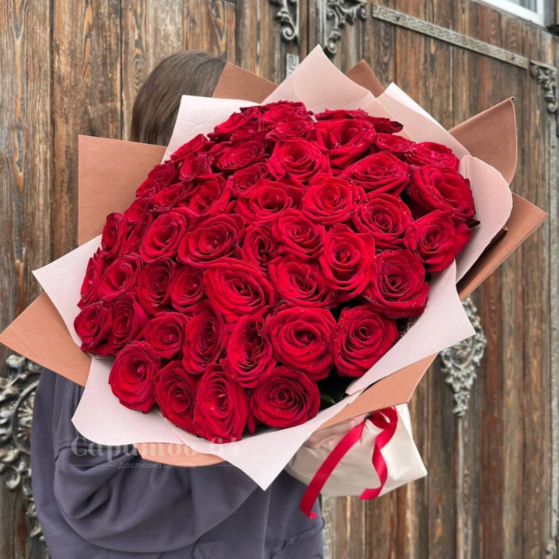 Роскошный букет из 51 бархатной красной розы, великолепный подарок для самых значимых моментов. Насыщенный алый цвет и безупречная форма цветов создают атмосферу торжественности и романтики. Букет элегантно упакован в мягкую бежевую бумагу, подчеркивающую красоту и свежесть цветов.