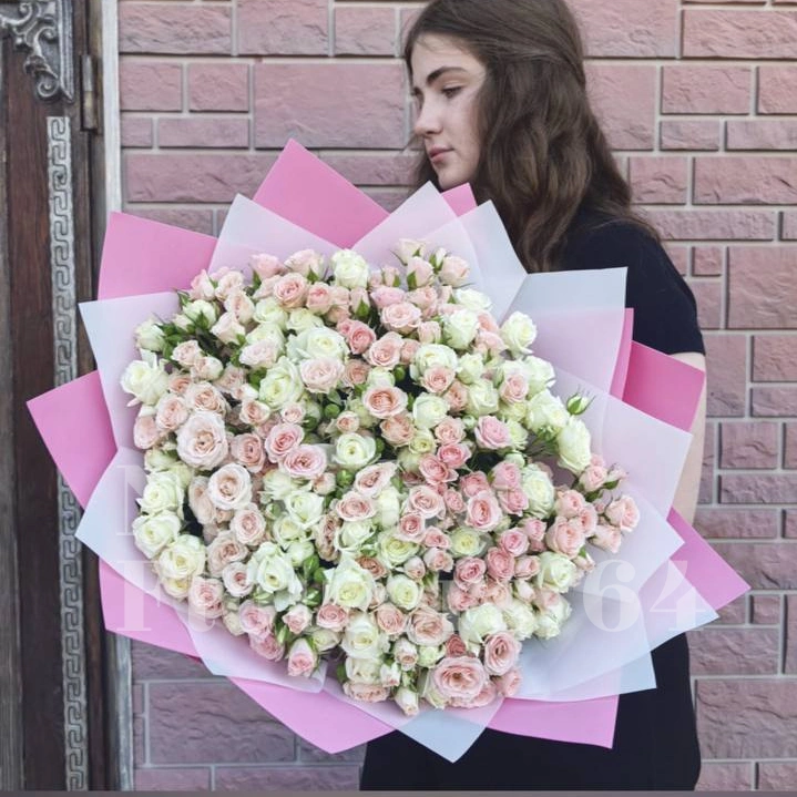 Букет, представленный на изображении, состоит из множества небольших розовых и белых роз, которые собраны в пышную композицию. Нежные оттенки цветов создают атмосферу уюта и романтики, делая букет идеальным выбором для выражения тёплых чувств. Этот букет станет прекрасным подарком для близкого человека, наполняя его внимание особой теплотой и заботой.