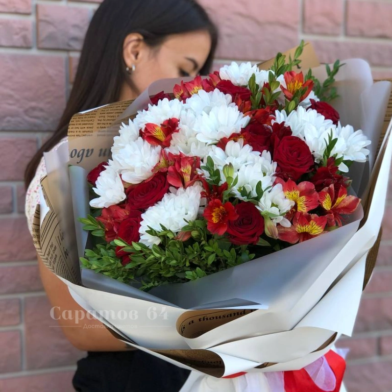 Букет с ромашковой хризантемой и розами «Яркая зима»