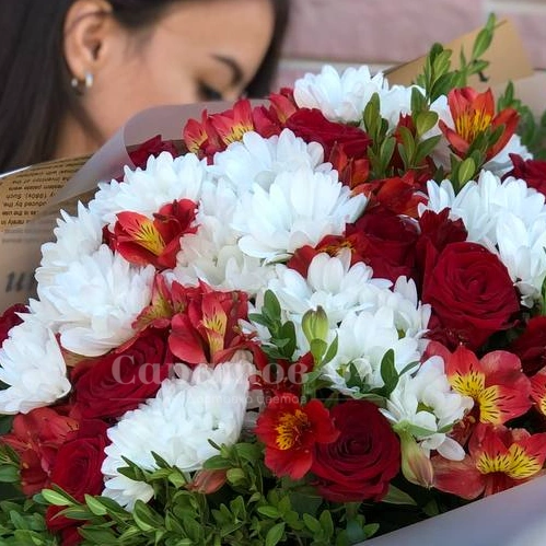 Яркий букет микс гипсофил, хризантем, роз и альстромерий