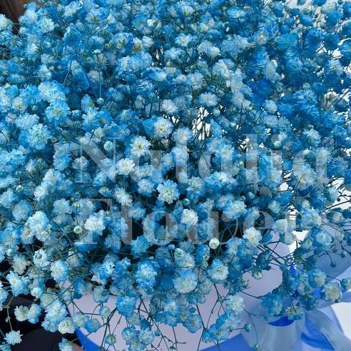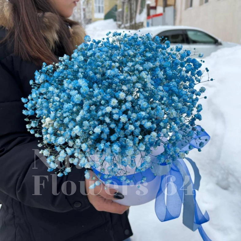 Букет, представленный на фотографии, - это нежное и воздушное сочетание голубой и белой гипсофилы, создающее эффект лёгкого облака. Композиция оформлена в белой круглой коробке с голубой лентой, завязанной в элегантную ленту, что добавляет букету изысканности и завершённости. Этот букет идеально подойдёт для подарка или как дополнение к основному букету цветов, придавая ему воздушность и романтичность.