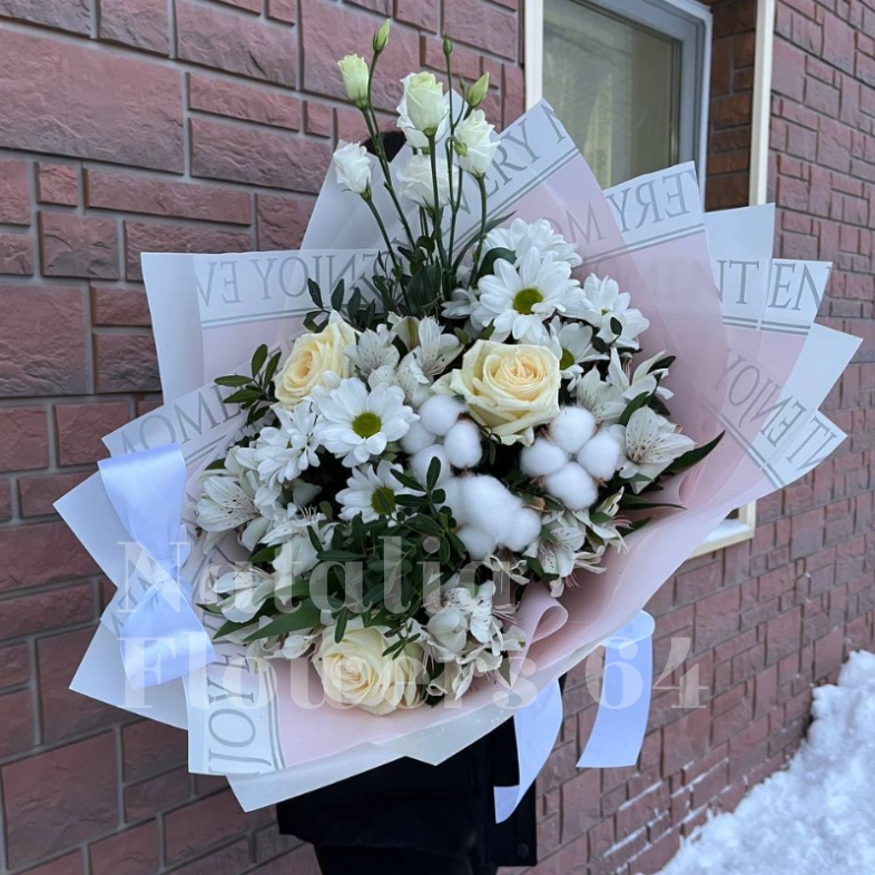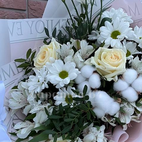 Букет "Нежность" - это изящное сочетание белых роз, ромашек и лилий, дополненное пушистым хлопком. Нежные оттен