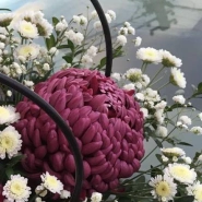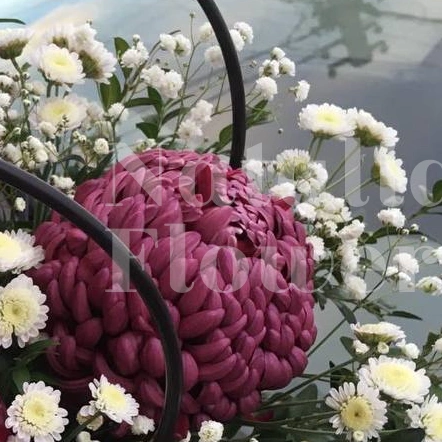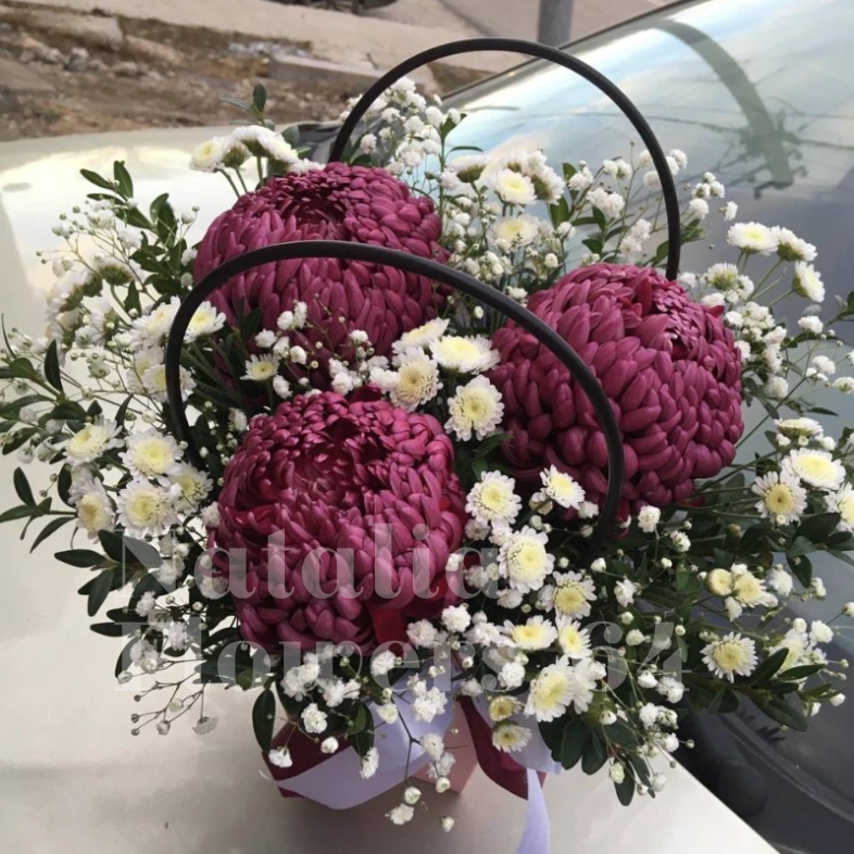 Букет, представленный в изящной корзинке с ажурной ручкой, - это элегантная композиция из крупных бузонов розовой хризантемы и мелких белых ромашек. Нежные белые цветы эффектно дополняют насыщенный цвет хризантем, создавая воздушную и романтичную атмосферу. Этот букет станет прекрасным подарком для тех, кто ценит красоту и изящество.