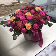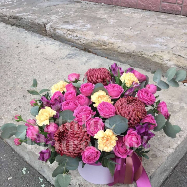 Букет в коробке являет собой яркую комбинацию розовых роз, крупных бордовых скабиоз и желтых гвоздик, украшенных нежно-зелеными веточками эвкалипта и дополненных атласной лентой. Собранные в элегантную композицию, эти цветы создают эффектную и запоминающуюся аранжировку. Пышный букет обязательно порадует яркими красками и насыщенными ароматами.