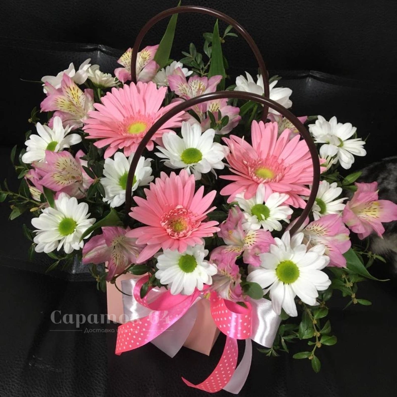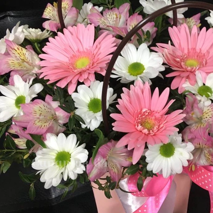 Нежная цветочная композиция, включающая розовые герберы и белые хризантемы, идеально подойдёт для выражения тёплых чувств и светлых эмоций. Букет завернут в изящную упаковку с атласной лентой, добавляющей ему элегантности и изысканности.