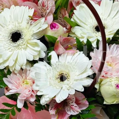 Нежный букет в светлых тонах, оформленный в виде сумочки с изящной ручкой и элегантной розовой лентой. Композиция включает белые гвоздики, розовые хризантемы и альстромерии, создавая воздушный и романтичный образ. Этот букет станет прекрасным подарком для тех, кто ценит лёгкость и красоту.