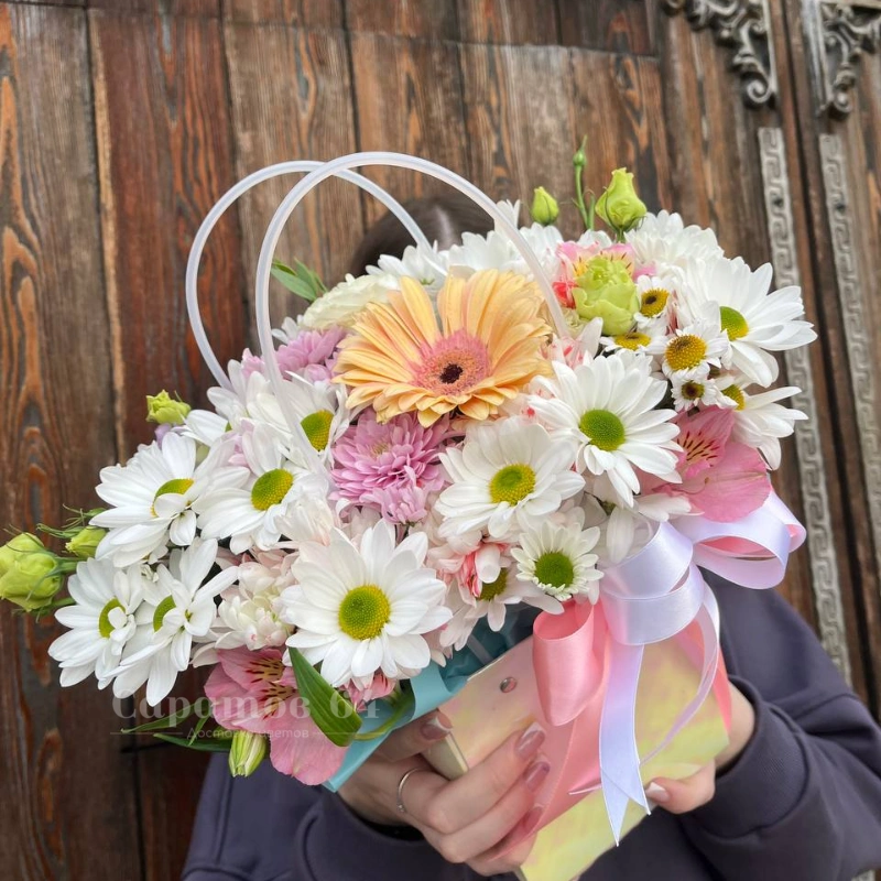 ГлавнаяКаталогКомпозицииЦветы в сумочке «летнее утро»