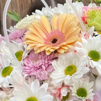 Букет представляет собой нежную цветочную композицию в корзинке, украшенную атласной лентой. В букете представлены ромашки, хризантемы и альстромерии белого и розового оттенков, а также яркая оранжевая гербера. Нежные тона и воздушная структура букета делают его легким и трогательным, идеально подходящим для выражения светлых чувств и эмоций.