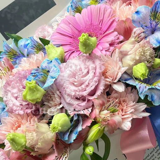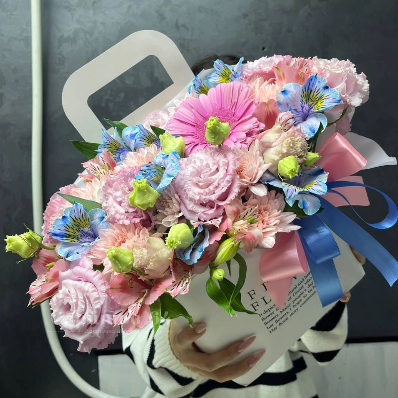 Нежный букет в элегантной коробке, украшенный атласными лентами розового и голубого оттенков. Сочетание гвоздик, гербер и альстремерий создает воздушную композицию, наполненную свежестью и теплотой.