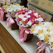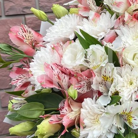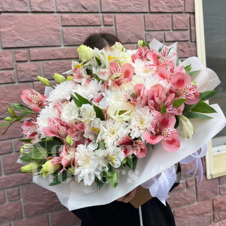 Этот букет - настоящее произведение искусства, сочетающее в себе нежные белые хризантемы, элегантные белые розы и яркие розовые альстромерии. Букет, элегантно упакованный в белую бумагу с атласной лентой, дарит ощущение свежести, радости и безграничной любви.