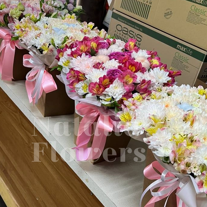 ГлавнаяКаталогКомпозицииЦветочная композиция в коробке «Трапеция розово-белая»