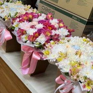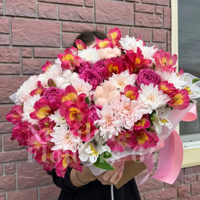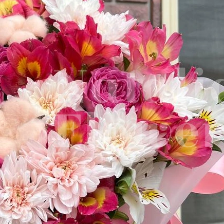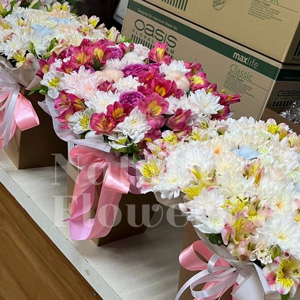 Цветочная композиция в картонной коробке в розовых и белых тонах. В букете использованы розовые пионовидные розы, нежные кустовые хризантемы, а также цветы альстромерии. Этот изысканный букет станет прекрасным подарком для любимых и друзей.