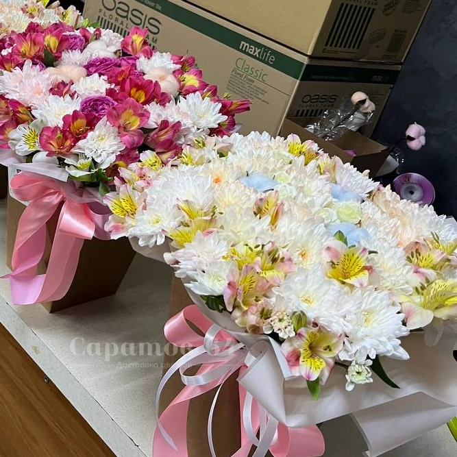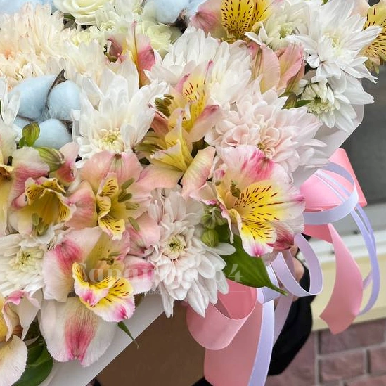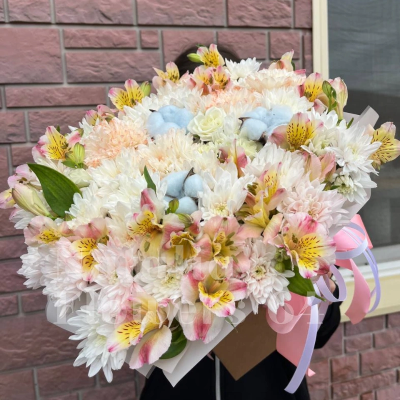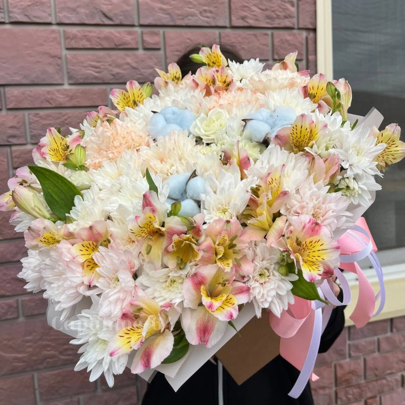 Букет, представленный на изображении, это пышная и элегантная композиция, в которую входят белые и бледно-розовые хризантемы, альстромерии с нежными оттенками и голубые гортензии, добавляющие ему воздушность. Нежные тона букета подчеркивают его свежесть и изящество, делая его прекрасным выбором для любого торжества. Дополненный атласными розовыми и белыми лентами, букет выглядит как настоящее произведение искусства, способное украсить любой особый момент.