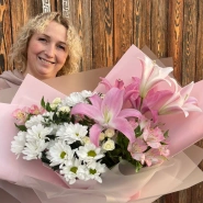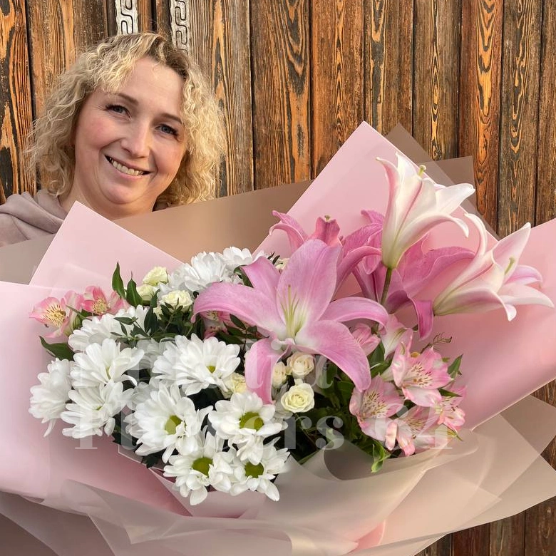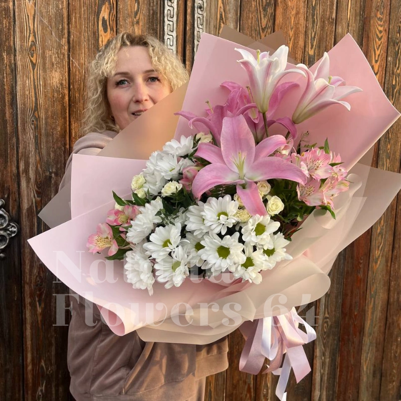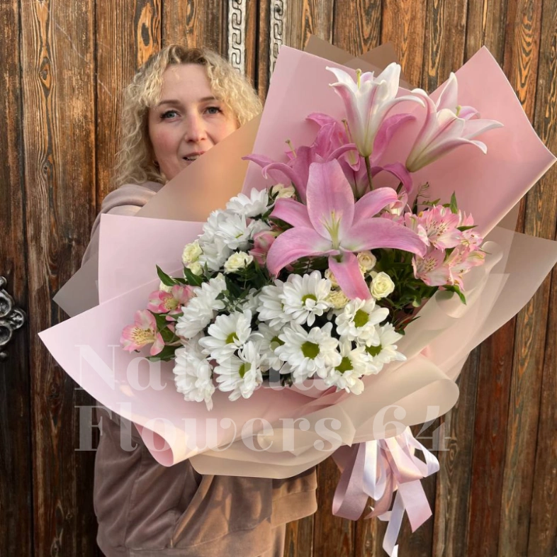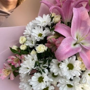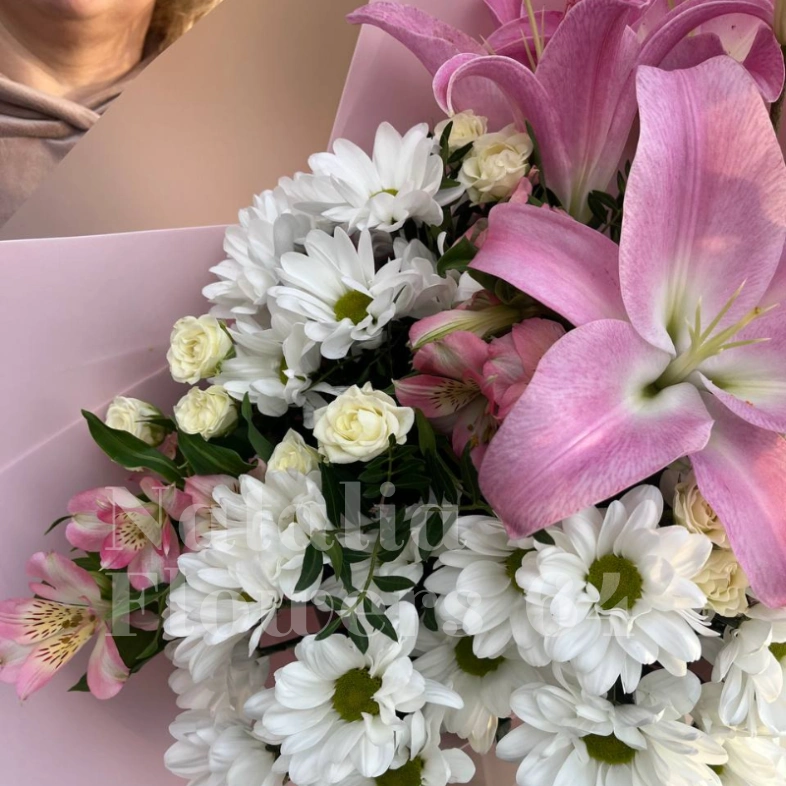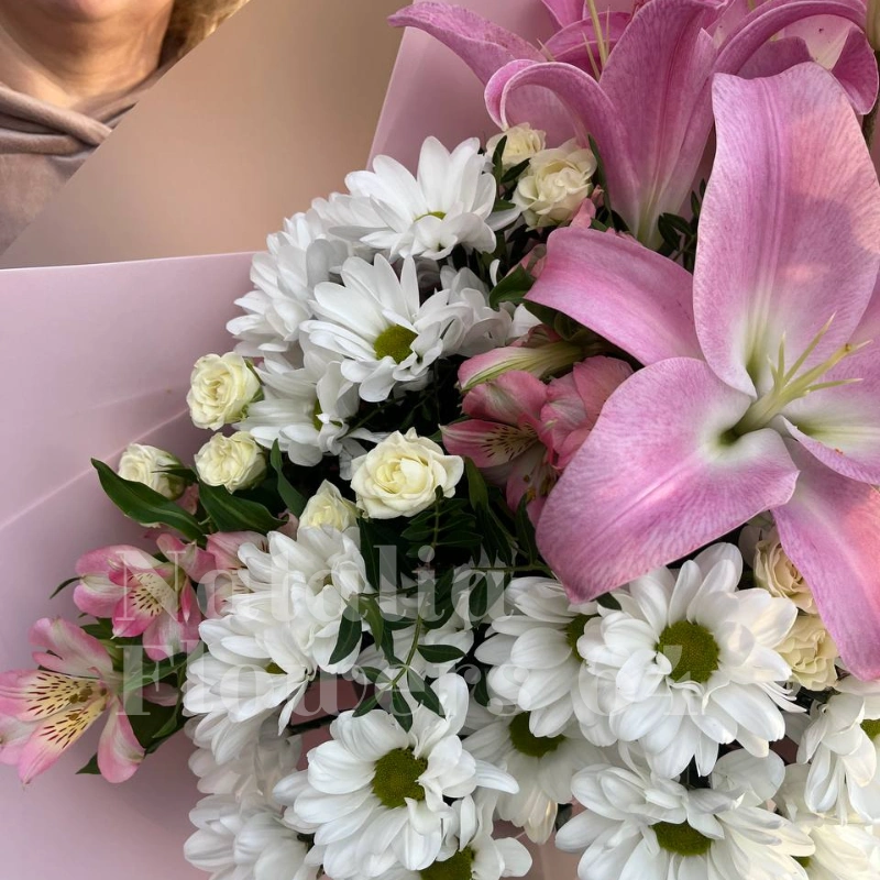 Букет из белых хризантем и нежно-розовых лилий станет изысканным подарком для самых дорогих и близких. Нежные оттенки цветов и элегантная упаковка создают атмосферу утончённости и изящества, идеальны для любого торжества.