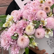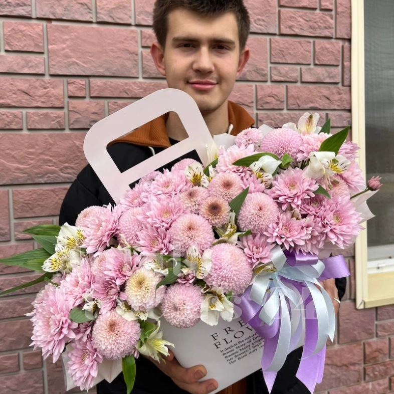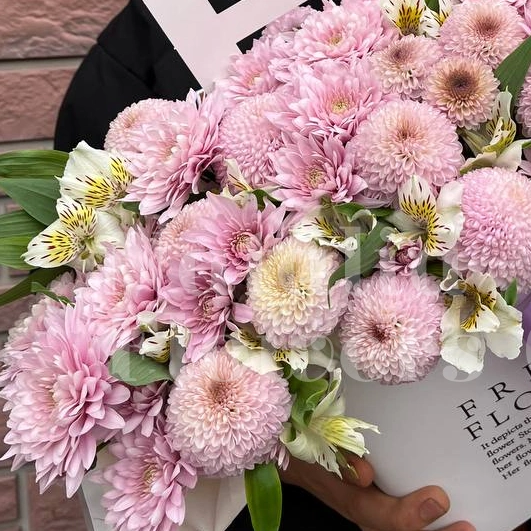 Букет ;Нежность;; ; Нежный букет, созданный из;пышных розовых хризантем и;изящных лилий. Невероятная цветочная композиция, оформленная лентами разных оттенков.