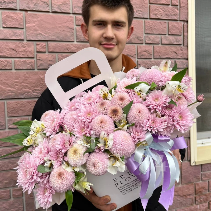 ГлавнаяКаталогКомпозицииКомпозиция цветочная в сумочке « лавандовый чизкейк»