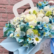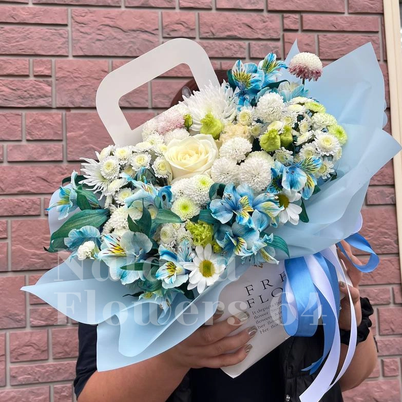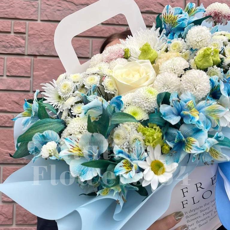 Свежий букет в нежных оттенках белого и голубого - это идеальный подарок для того, чтобы выразить свои чувства. Прекрасная композиция из ромашек, роз и ирисов обязательно вызовет улыбку на лице адресата. Букет станет отличным выбором для любого торжества или просто для того, чтобы поднять настроение.