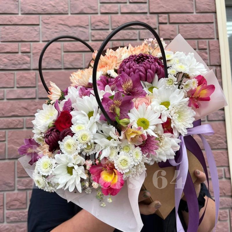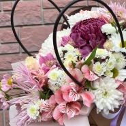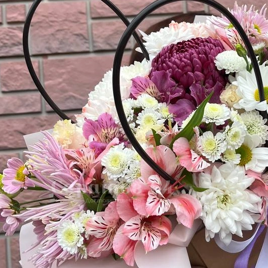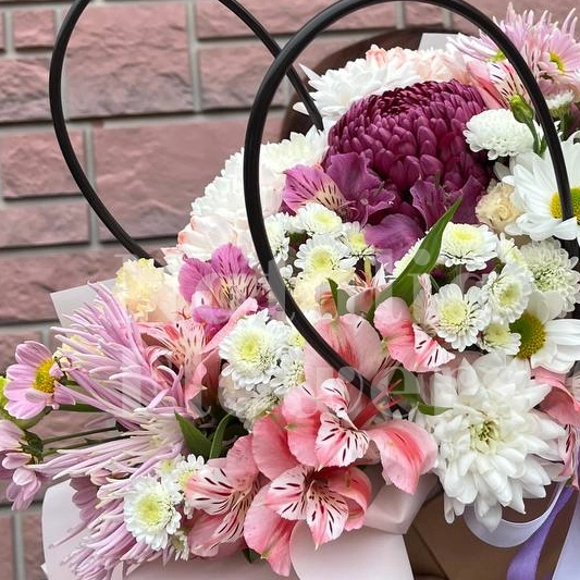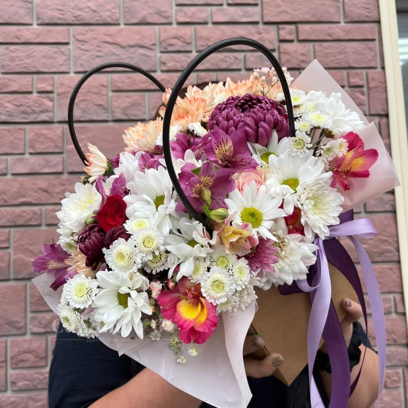 Букет, представленный в нежных оттенках розового, фиолетового и белого, станет идеальным подарком для самых дорогих и близких людей. Композиция из свежих ромашек, альстромерий и хризантем. Такой подарок обязательно вызовет искренние эмоции и улыбку.