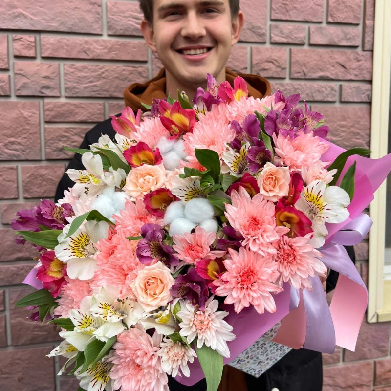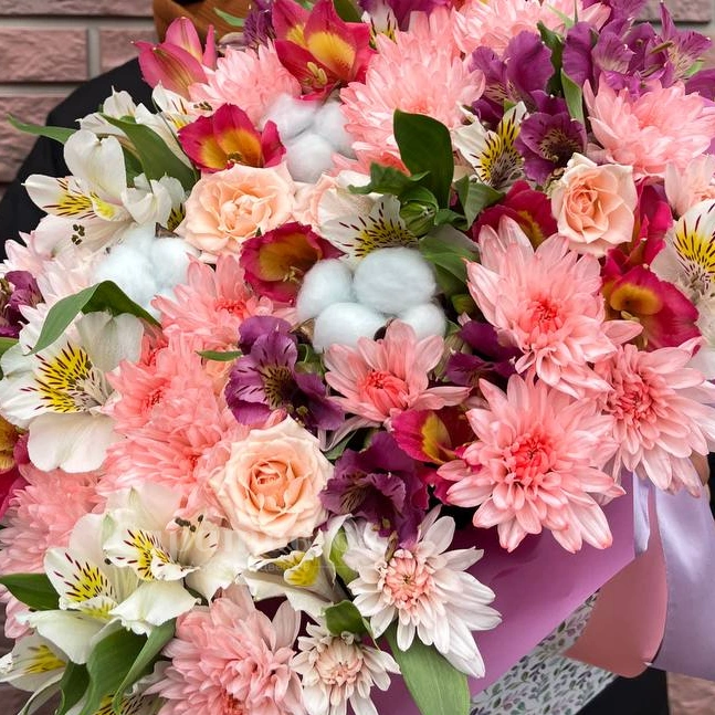 Букет из розовых и белых цветов, включающий хризантемы, альстремерии и розы. Нежные оттенки и мягкие формы создают романтичный и воздушный образ, идеальный для подарка. Композиция украшена лёгкой упаковкой с лентой, добавляющей завершённый и элегантный вид.