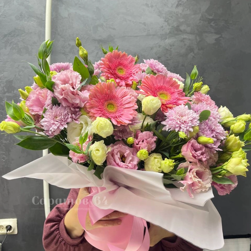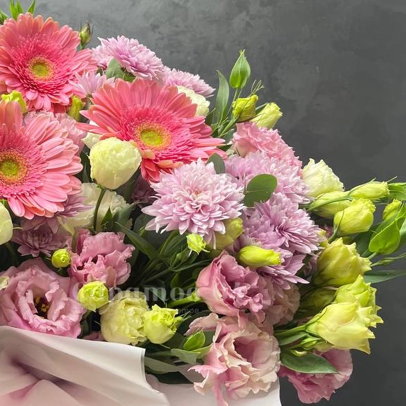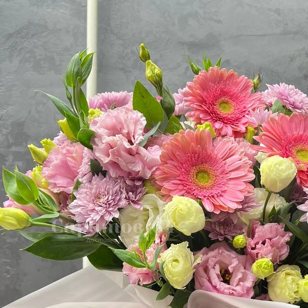 Букет, представленный на изображении, это великолепная композиция из розовых и белых цветов, включающая хризантемы, нежную эустому и герберы. Нежные оттенки создают ощущение легкости и воздушности, делая букет идеальным выбором для любого торжества. Красивая упаковка добавляет особый шарм, подчеркивая свежесть и красоту цветов.