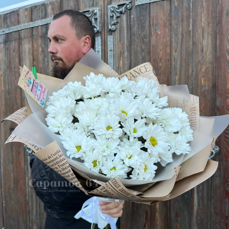 Букет из белых хризантем, символизирующих чистоту и благородство, оформлен в натуральную бумагу с декоративными элементами. Сдержанная элегантность и природная красота цветов делают его выразительным и стильным подарком. Отличный выбор для тех, кто ценит лаконичность и изящество.