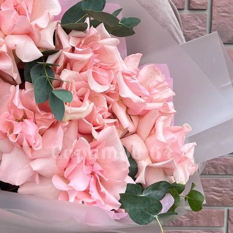 Букет из нежных розовых роз, элегантно оформленный в полупрозрачную обёртку с атласной лентой, создаёт образ изысканной простоты и романтики. Воздушная упаковка подчёркивает красоту цветов, а зелень добавляет свежести. Этот букет идеально подойдёт для выражения деликатных чувств и элегантного подарка.