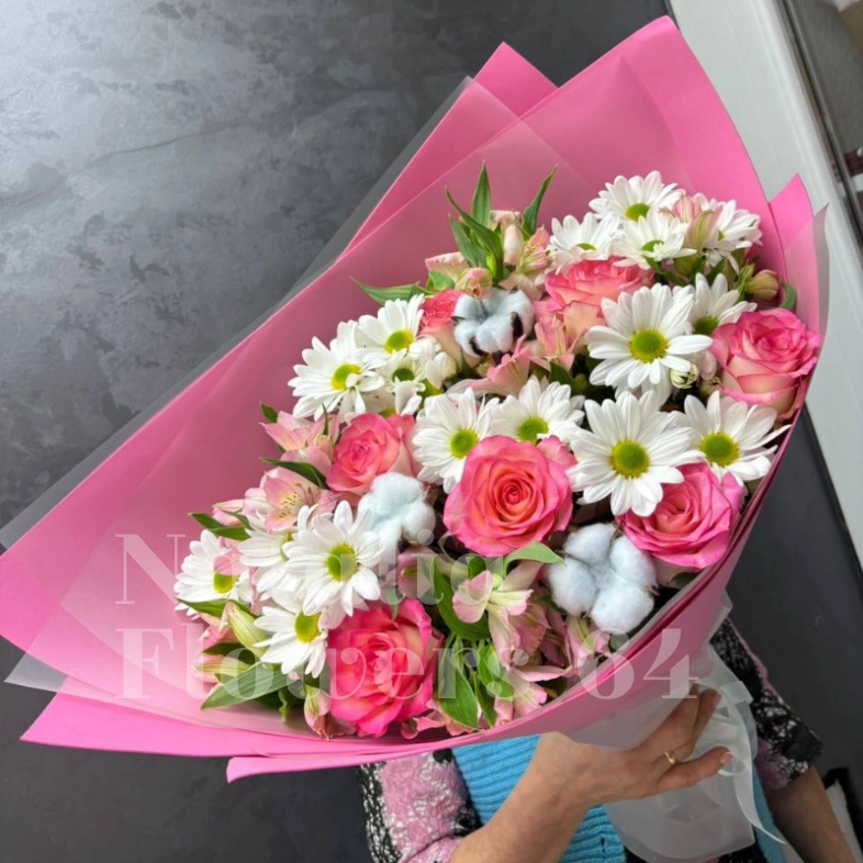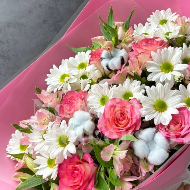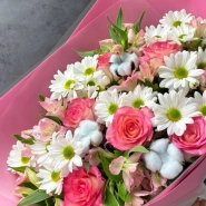 Букет представляет собой нежную композицию из розовых роз, белых хризантем и пушистого хлопка, создающую трогательный и элегантный образ. Необычная упаковка в яркий розовый цвет добавляет образу игривости и делает букет еще более запоминающимся. Этот букет станет прекрасным подарком для близких и порадует их своей красотой и свежестью.