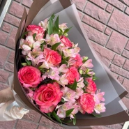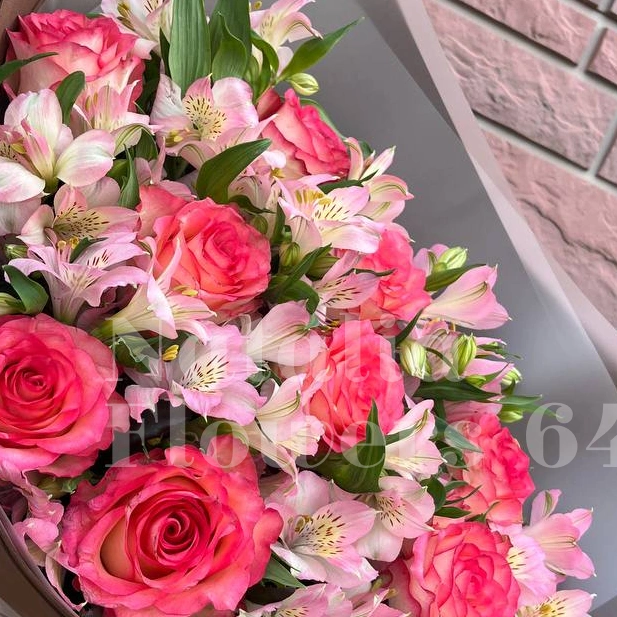 Этот букет - нежная комбинация розовых роз и альстромерий, создающая воздушный и элегантный образ. Сочетание ярких роз и изящных альстромерий наполняет композицию легкостью и теплом. Букет идеально подходит для выражения искренних чувств и эмоций.