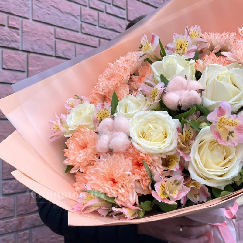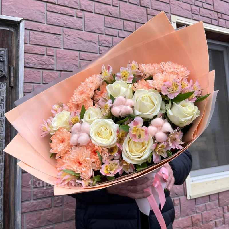 Букет с розами, хризантемами и альстромериями «персиковый десерт»