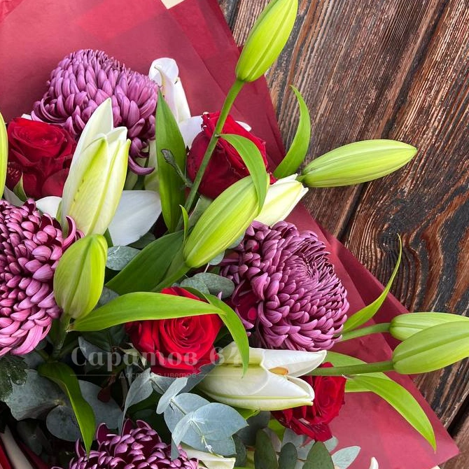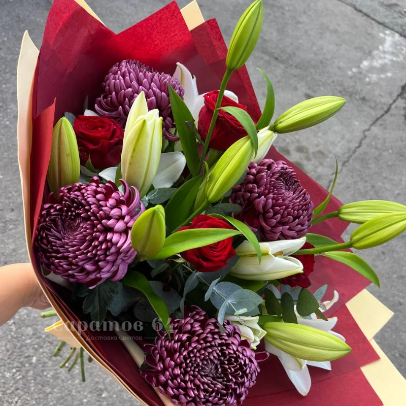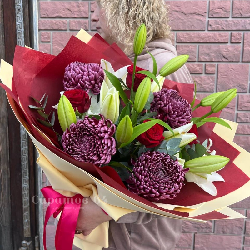 ГлавнаяКаталогБукетыБукет с лилиями и хризантемой «магический аромат»