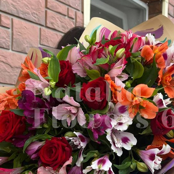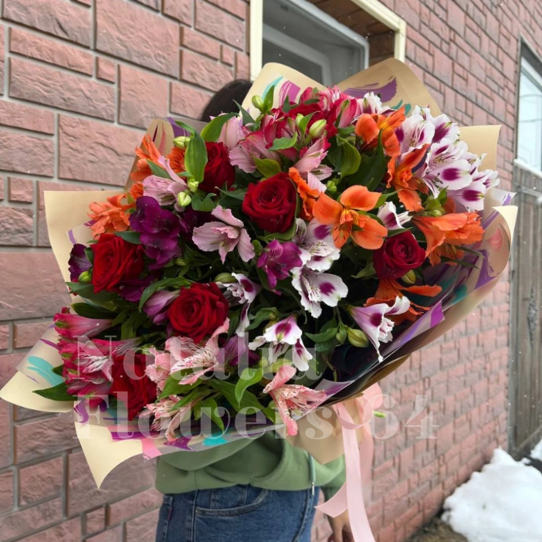 Яркий и насыщенный букет, полный жизни и красок. Розы и альстромерии переплетаются в великолепной комбинации, наполняя пространство яркими оттенками и нежным ароматом