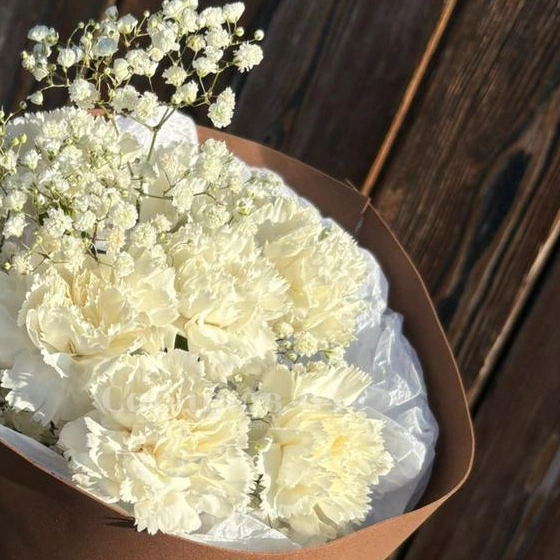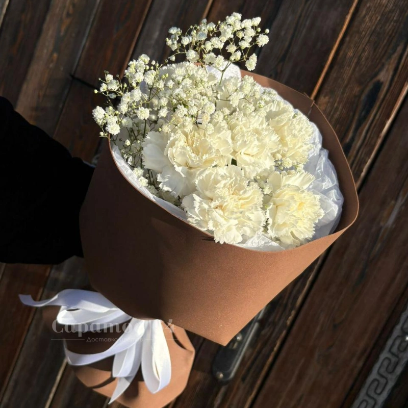 Букет из белых гвоздик и гипсофилы, оформленный в коричневую упаковку с атласной лентой. Нежные цветы создают воздушную композицию, идеальную для выражения светлых чувств и тёплых пожеланий. Этот букет станет прекрасным подарком для любого торжества.
