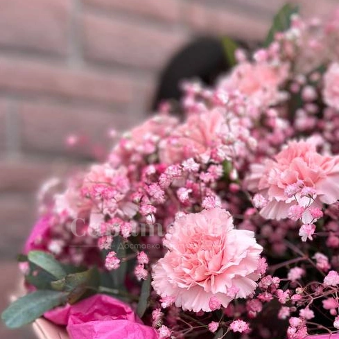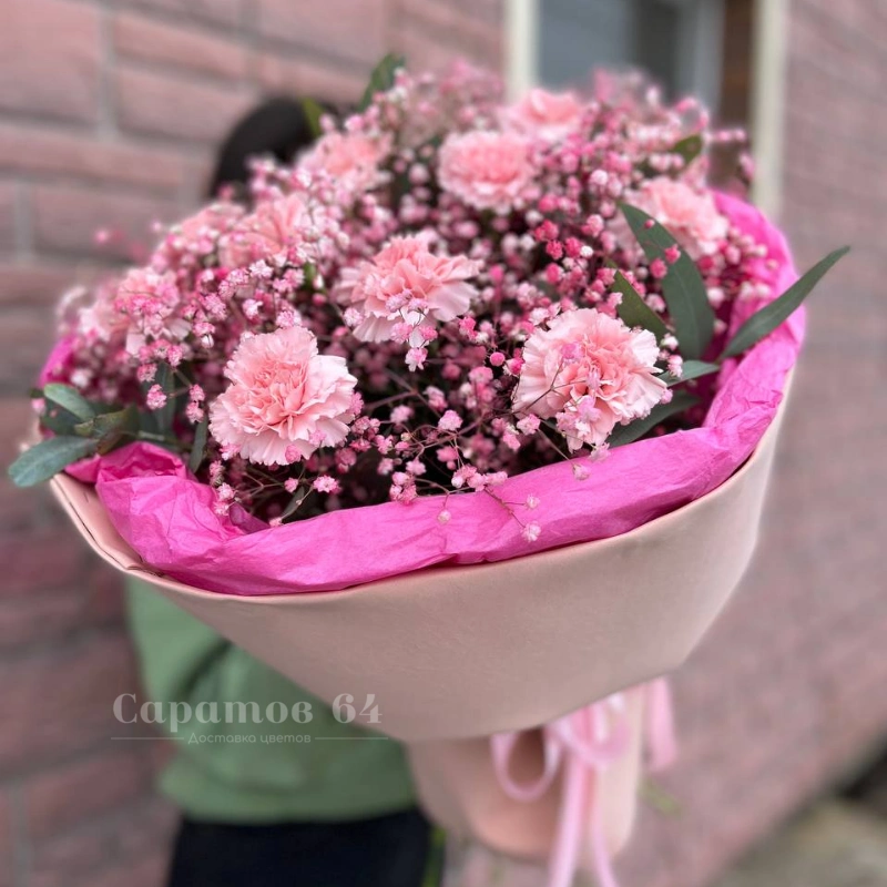 Нежный букет с легким оттенком элегантности и изящества. Композиция из гвоздик и гипсофилы, окутанная в мягкую розовую упаковку, дарит ощущение воздушности и романтики. Этот букет идеален для выражения самых искренних чувств и создания праздничного настроения.
