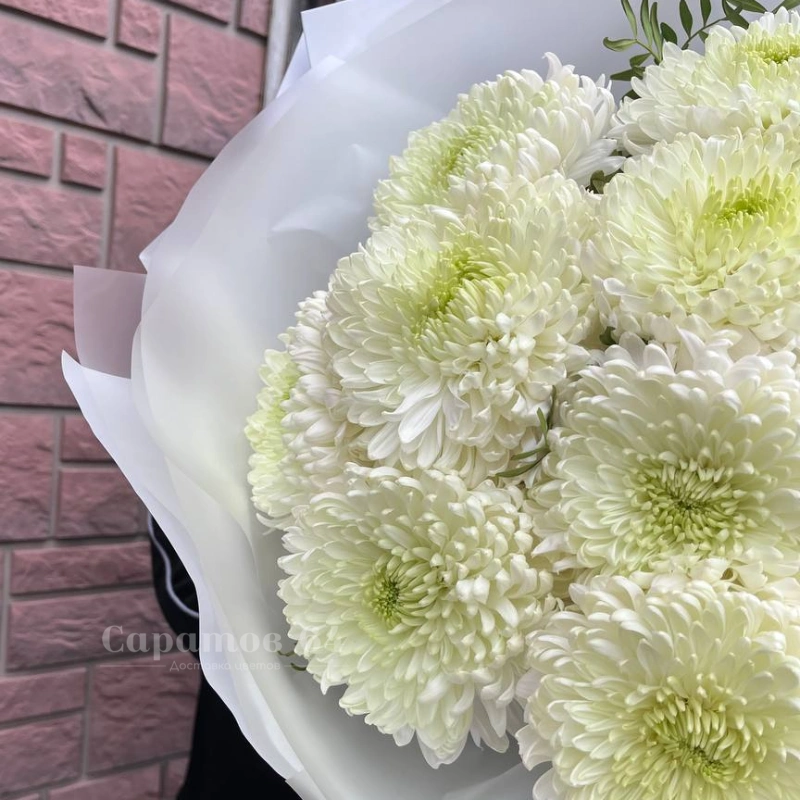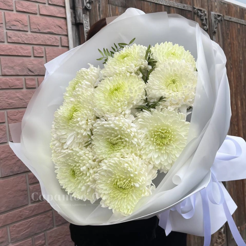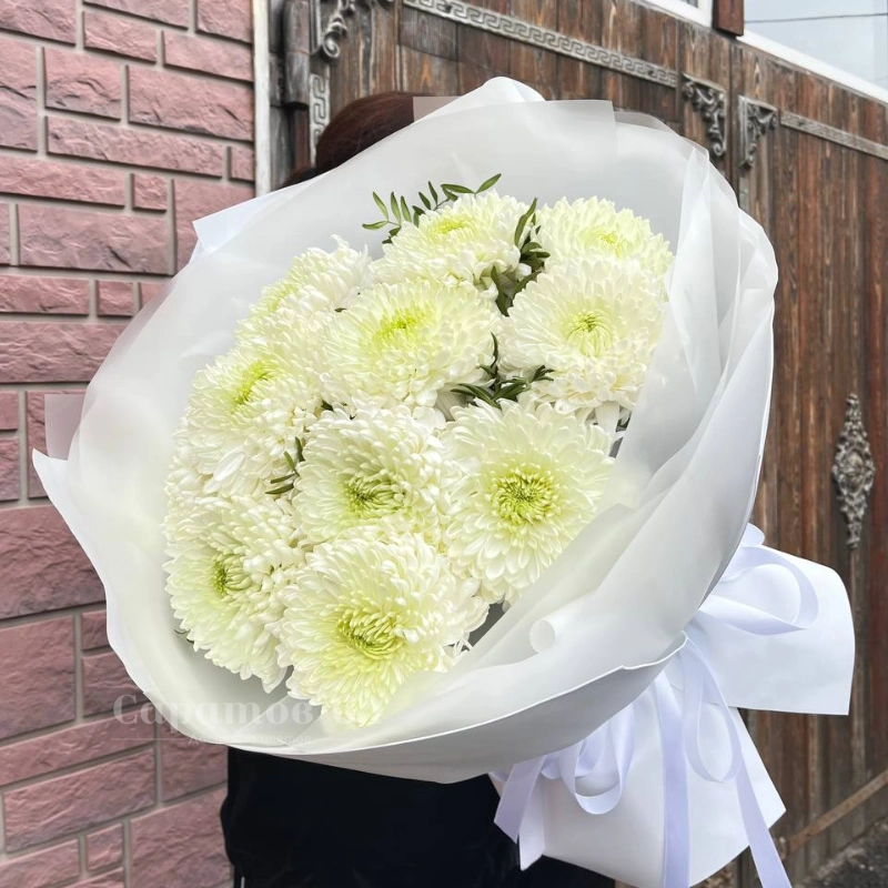 Букет из белых хризантем, элегантно упакованный в белую бумагу с воздушной лентой, создаёт ощущение чистоты и изящества. Хризантемы, символизирующие долголетие и счастье, идеально подходят для выражения глубоких чувств. Этот букет станет прекрасным подарком для близких и дорогих людей.