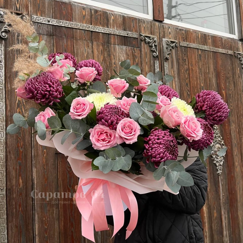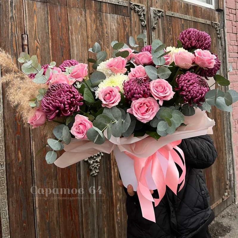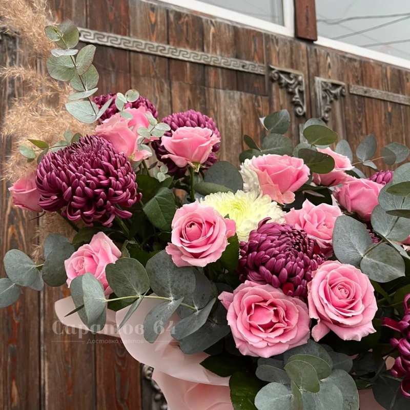 Композиция зи хризантем и эвкалипта в нежных тонах
