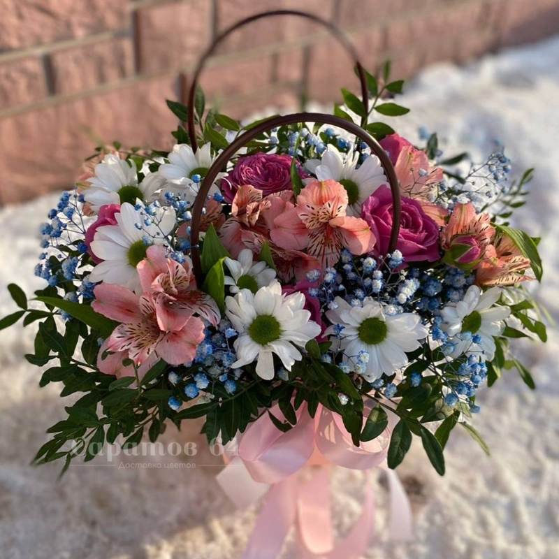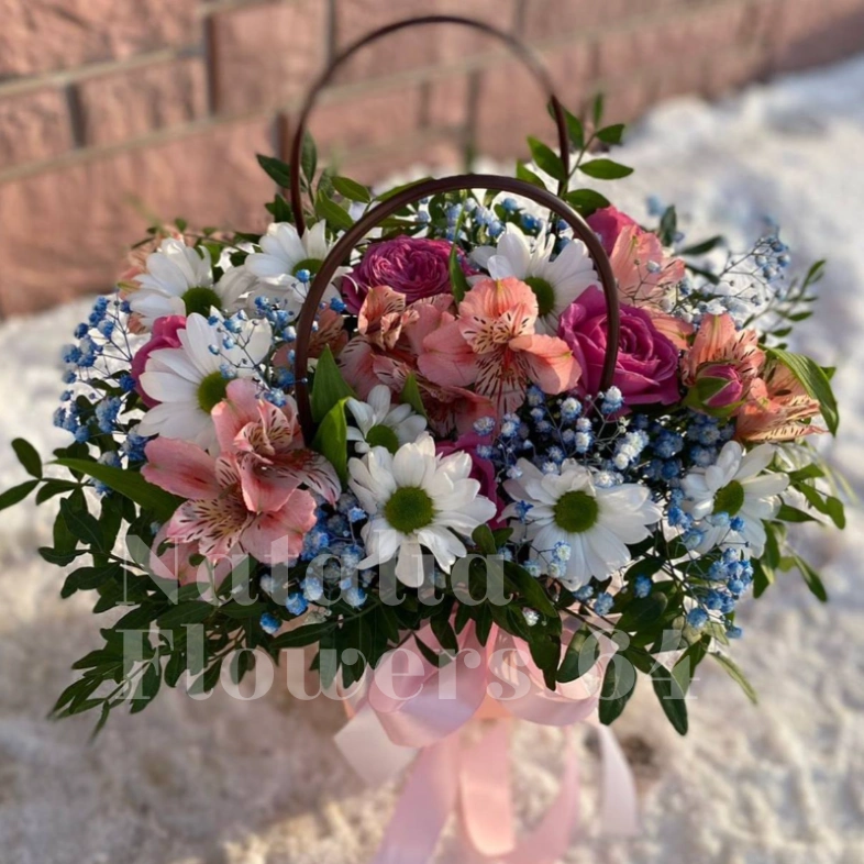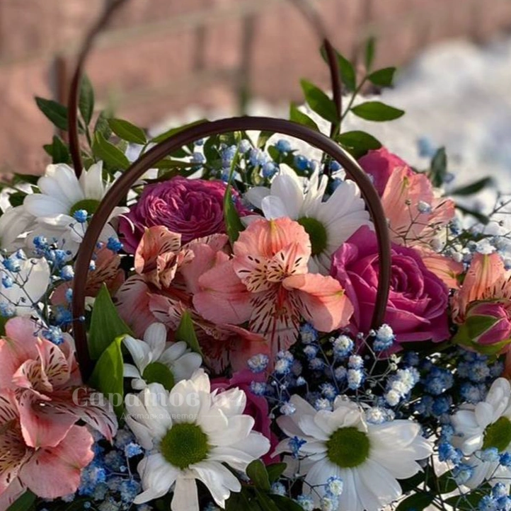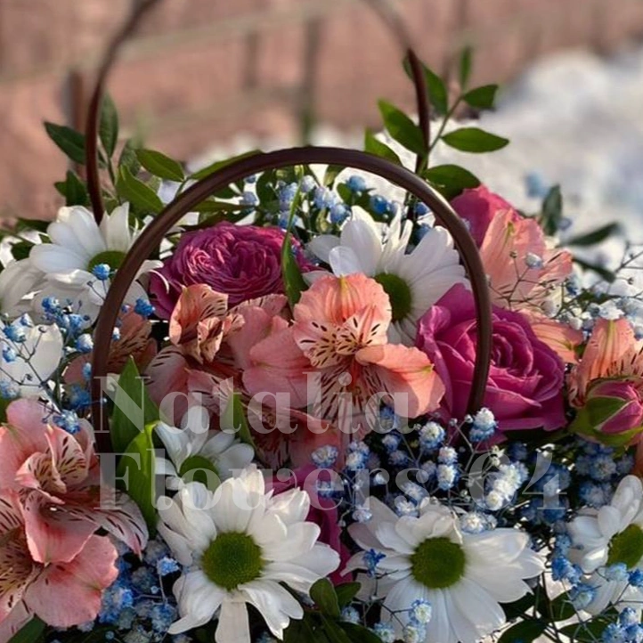 Букет в корзинке являет собой нежное сочетание розовых и белых оттенков, подчеркивая природную красоту и элегантность. Розы и альстромерии придают композиции насыщенный цвет и форму, в то время как гипсофила добавляет легкость и воздушность. Этот букет станет прекрасным подарком для любого торжества.
