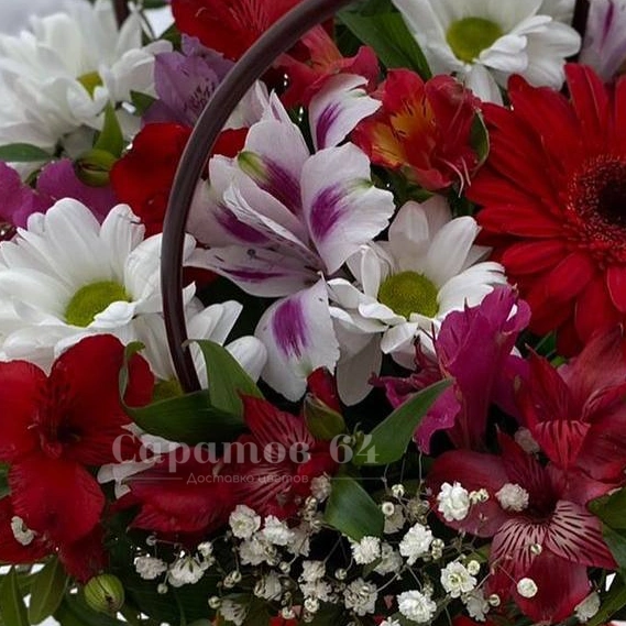Цветы в коробке-трапеции  микс с малиновыми альстромериями
