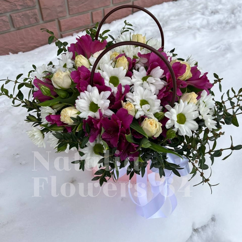 ГлавнаяКаталогКомпозицииЦветы в сумочке «яркий комплимент»