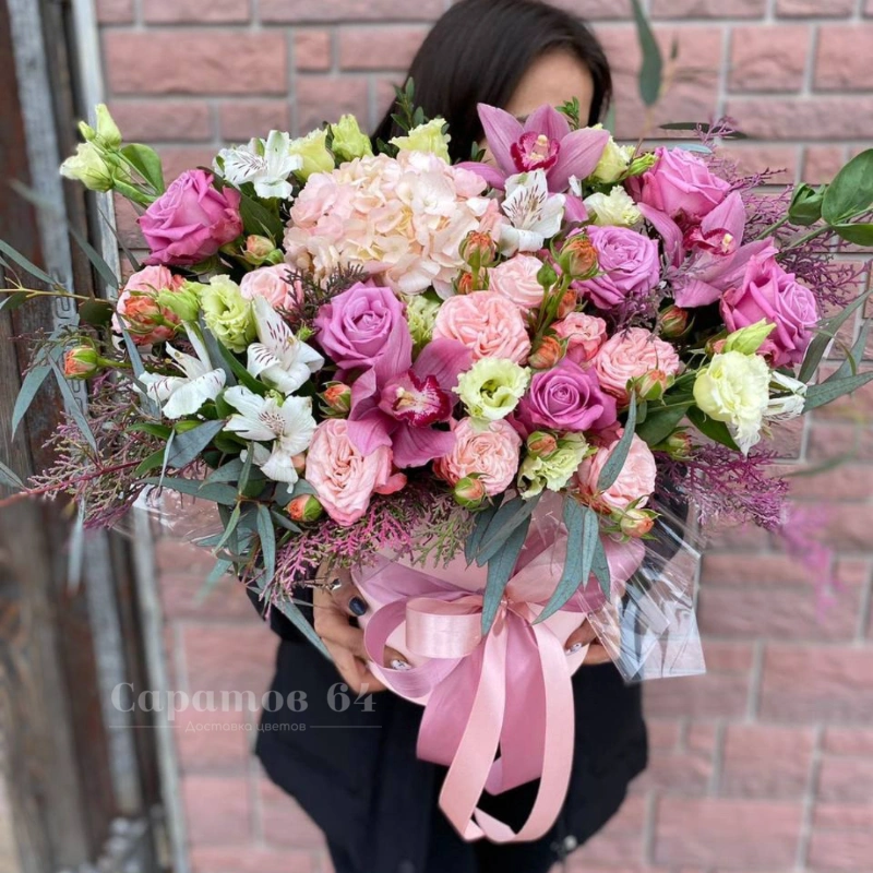 Цветы в коробке-трапеции  микс с малиновыми альстромериями