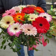 ГлавнаяКаталогКомпозицииГерберы в шляпной коробке «летний микс»