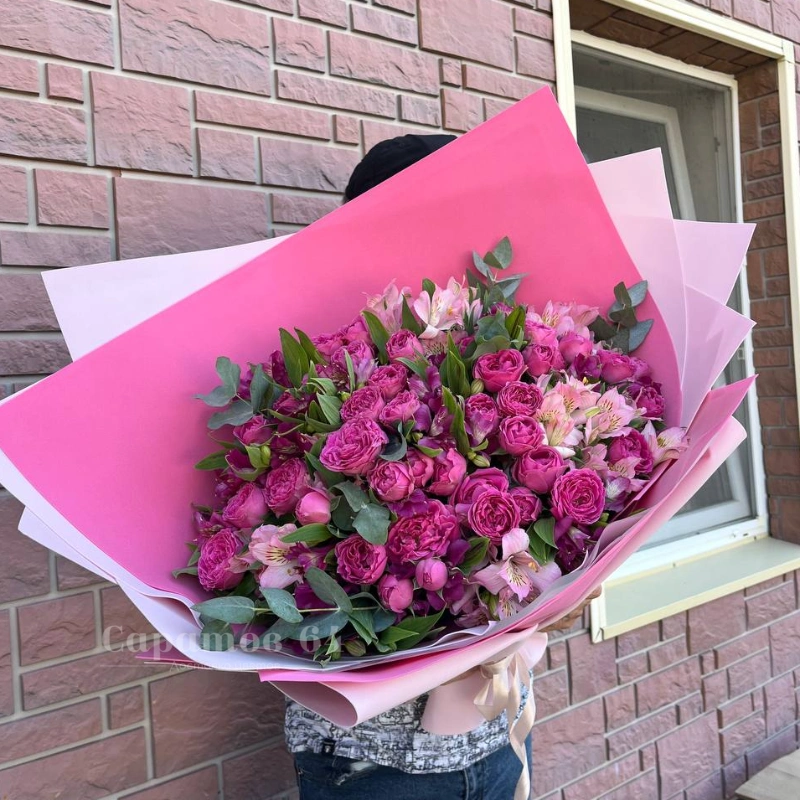 Яркий букет микс гипсофил, хризантем, роз и альстромерий