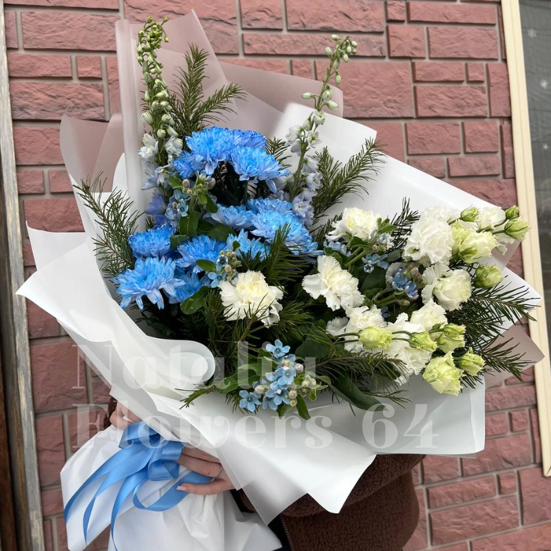 Букет, сочетающий в себе нежные оттенки голубого и белого, создает легкое и воздушное настроение. Хризантемы и дельфиниумы в оттенках голубого гармонично дополнены белыми розами, а изящные веточки и зелень добавляют композиции объем и текстуру. Этот букет прекрасно подойдет для любого торжества, наполняя его свежестью и элегантностью.