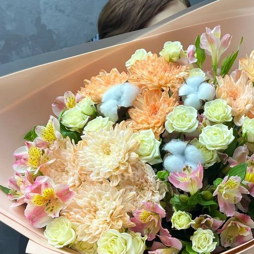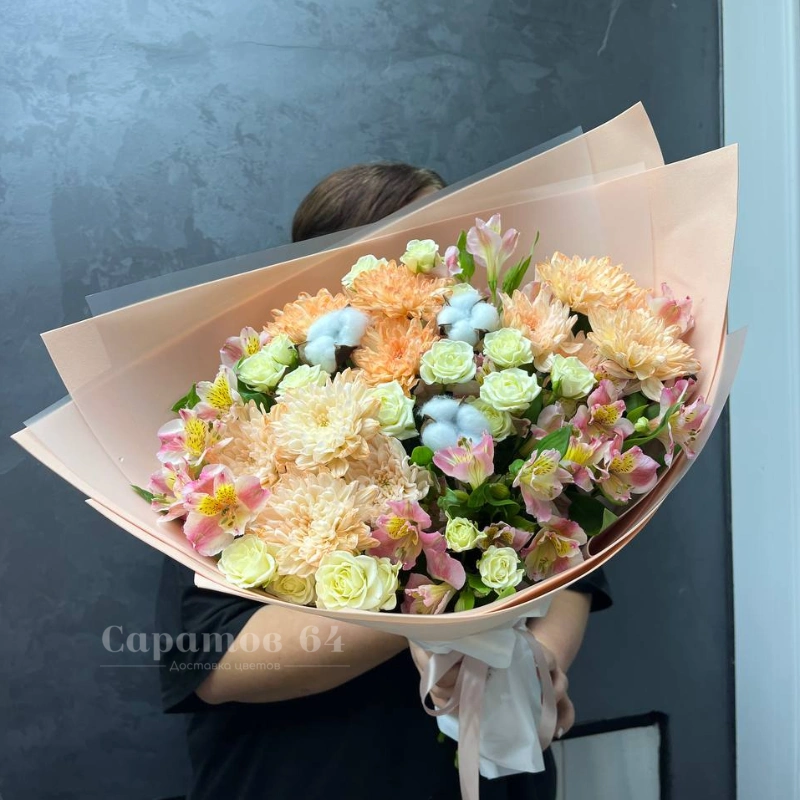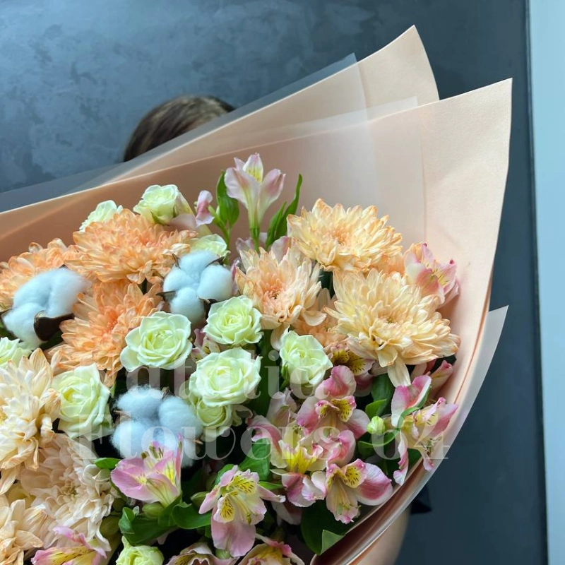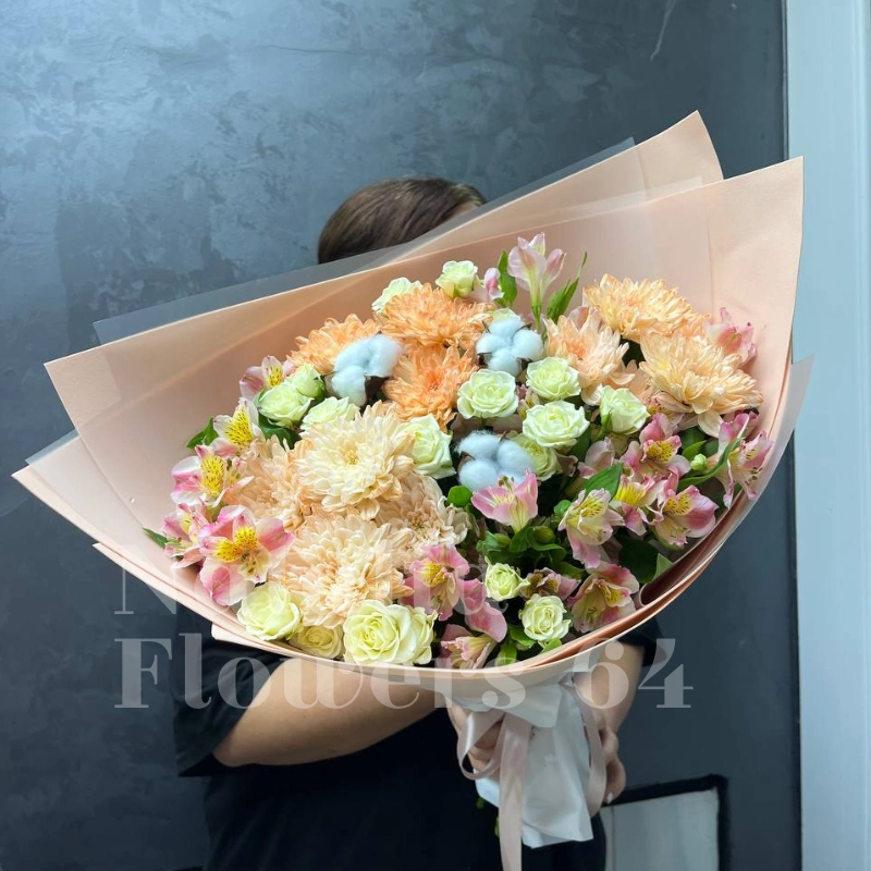 Букет представляет собой нежное сочетание розовых, персиковых и белых оттенков, создавая гармоничный образ. В его состав входят цветы различных сортов, включая крупные персиковые хризантемы, розовые и белые розы, а также альстромерии с их изящными лепестками. Букет идеально подойдёт для тех, кто ценит сдержанную элегантность и воздушность композиции.
