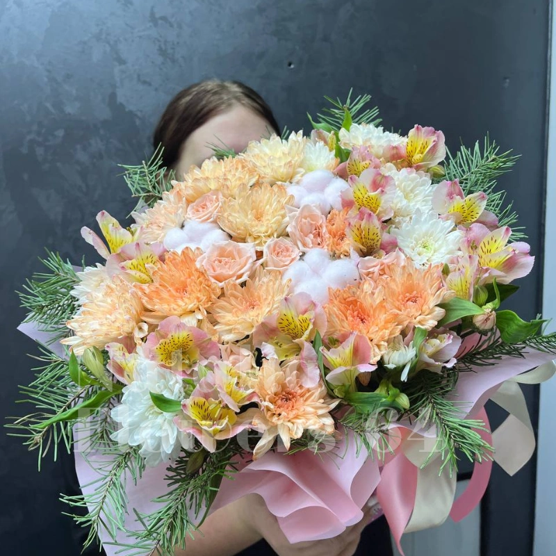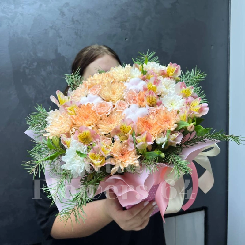 Букет с нежными оттенками розовых, персиковых и белых тонов, создающий уютную и романтичную атмосферу. Нежные цветы в сочетании с зеленью добавляют композиции свежесть и воздушность. Деликатные оттенки делают букет идеальным для выражения любви и заботы в любой момент.