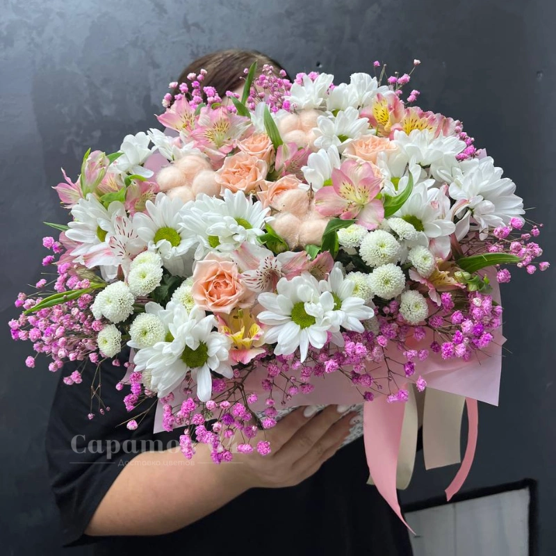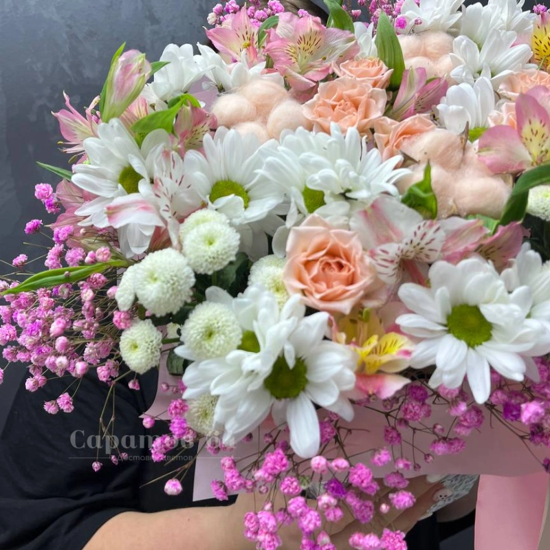 Букет "Нежное очарование" - это изящное сочетание белых и розовых оттенков, создающее атмосферу легкости и романтики. В его состав входят розы, альстромерии, хризантемы и гипсофила, гармонично дополняющие друг друга.