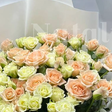 Этот букет представляет собой прекрасную композицию из роз в нежных оттенках персикового и светло-зеленого цветов. Розы собраны в пышный букет, символизирующий элегантность и изысканность. Букет идеально подходит для выражения признательности и восхищения.